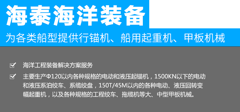 江蘇海泰海洋裝備有限公司位于素稱“銀杏之鄉(xiāng)”的泰興市,2018年投資建設(shè),至今已經(jīng)成為產(chǎn)品研發(fā)、生產(chǎn)制造,調(diào)試服務(wù)為一體的設(shè)備配套企業(yè)。公司從事海洋裝備(設(shè)備)及配件的制造、設(shè)計(jì)、安裝,維修;船用錨機(jī)、絞車、起重機(jī)、舾裝件、電氣設(shè)備、環(huán)保設(shè)備設(shè)計(jì)、制造。公司成立以來,就與中國(guó)船舶工業(yè)集團(tuán)公司第701所、702所、704所、708所、上海船舶研究設(shè)計(jì)院等多家船舶科研院所建立了技術(shù)合作關(guān)系,產(chǎn)品應(yīng)用于......